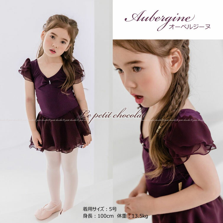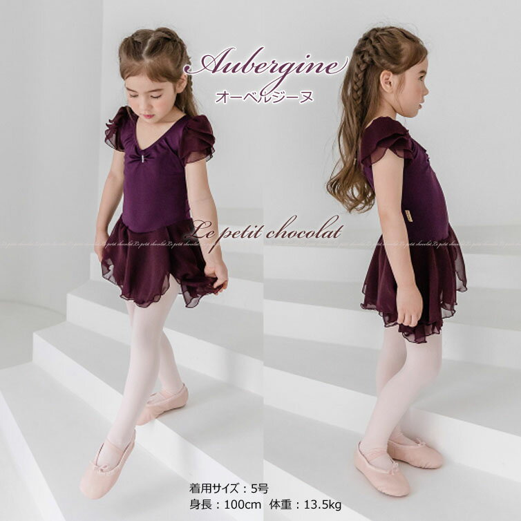 ■子供用バレエレオタード(半袖/スカート付) サイズ メーカー記載 サイズ 身幅 ガース スカート丈 100cm 5号 25cm 48cm 21cm 110cm 7号 27cm 50cm 22cm 115cm 9号 28cm 51cm 23cm 125cm 11号 29cm 52cm 24cm 135cm 13号 30cm 53cm 25cm 140cm 15号 32cm 56cm 28cm 145cm 17号 33cm 58cm 29cm ■素材・仕様 素材:タクテル ◆深みのある落ち着いた紫、オーベルジーヌ。